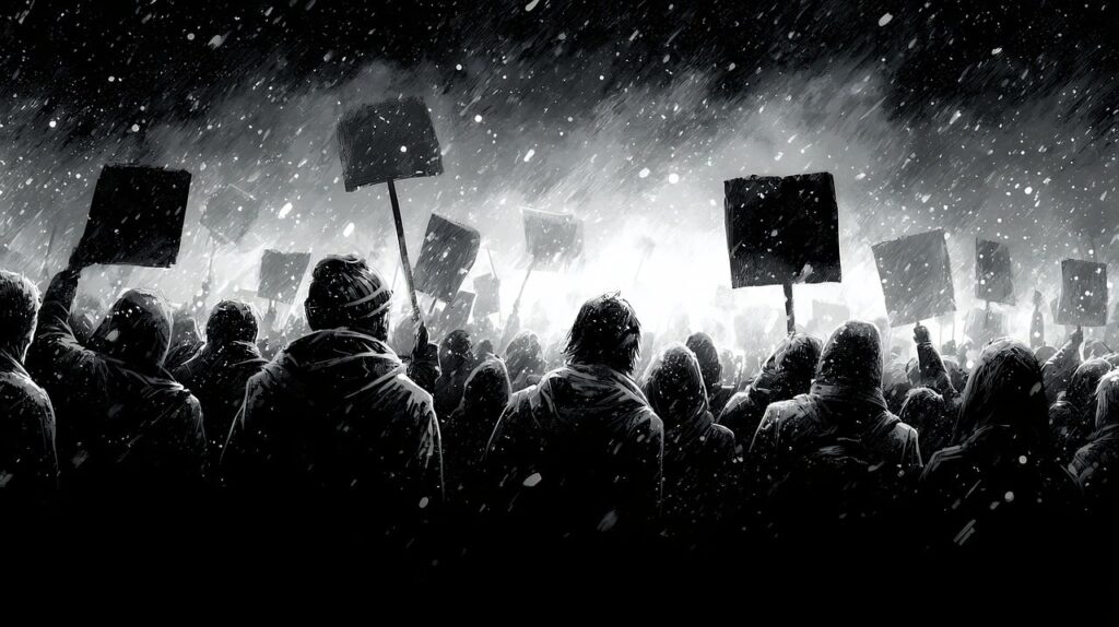 抗議団体が寒空の中、死人の扮装をして行列を作り、何かを訴えているデモ行進が見えました。